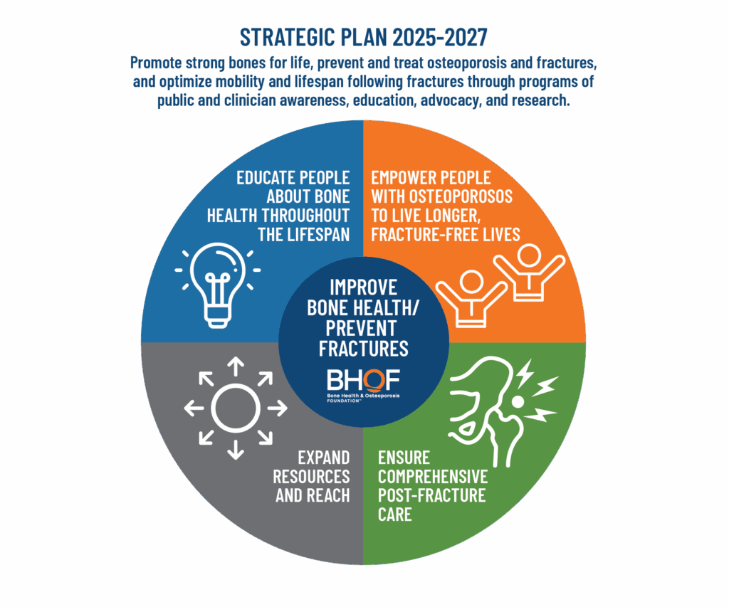 Promote strong bones for life, prevent and treat osteoporosis and fractures, and optimize mobility and lifespan following fractures through programs of public and clinician awareness, education, advocacy, and research.